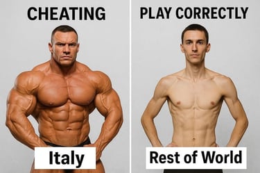 It shows the stark contrast between the exaggerated, steroid-fueled (obviously everyone has understood what I meant and what steroids are representing) physique labeled “Italy – Cheating, Play Dirty” and the lean, natural build labeled “Rest of World – Truth, Play Correctly.”